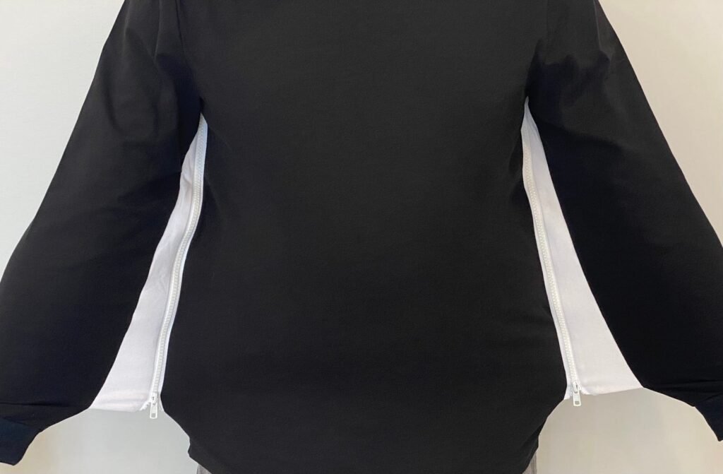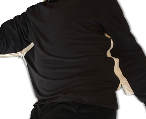 This sleep shirt is intentionally designed to restrict arm or arms movement during sleep through the use of zippers that secure the arms. It is intended for sleep or stationary rest only.